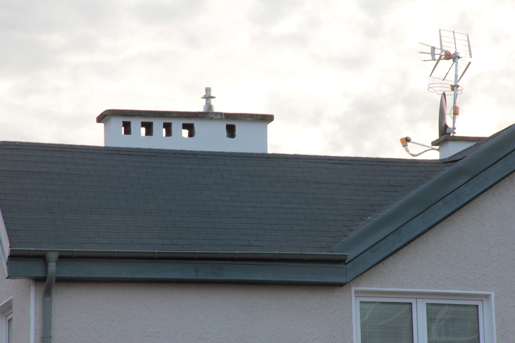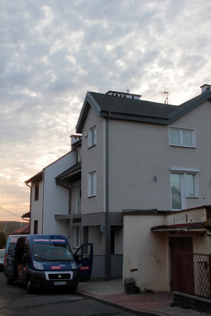 Na dachu ułożono bitumiczny gont bobra prostokąt B1 szary a orynnowanie zastosowano aluminiowe firmy Prefa o kolorze jasno szarym. Powierzchnia dachu to ok.184 m2.