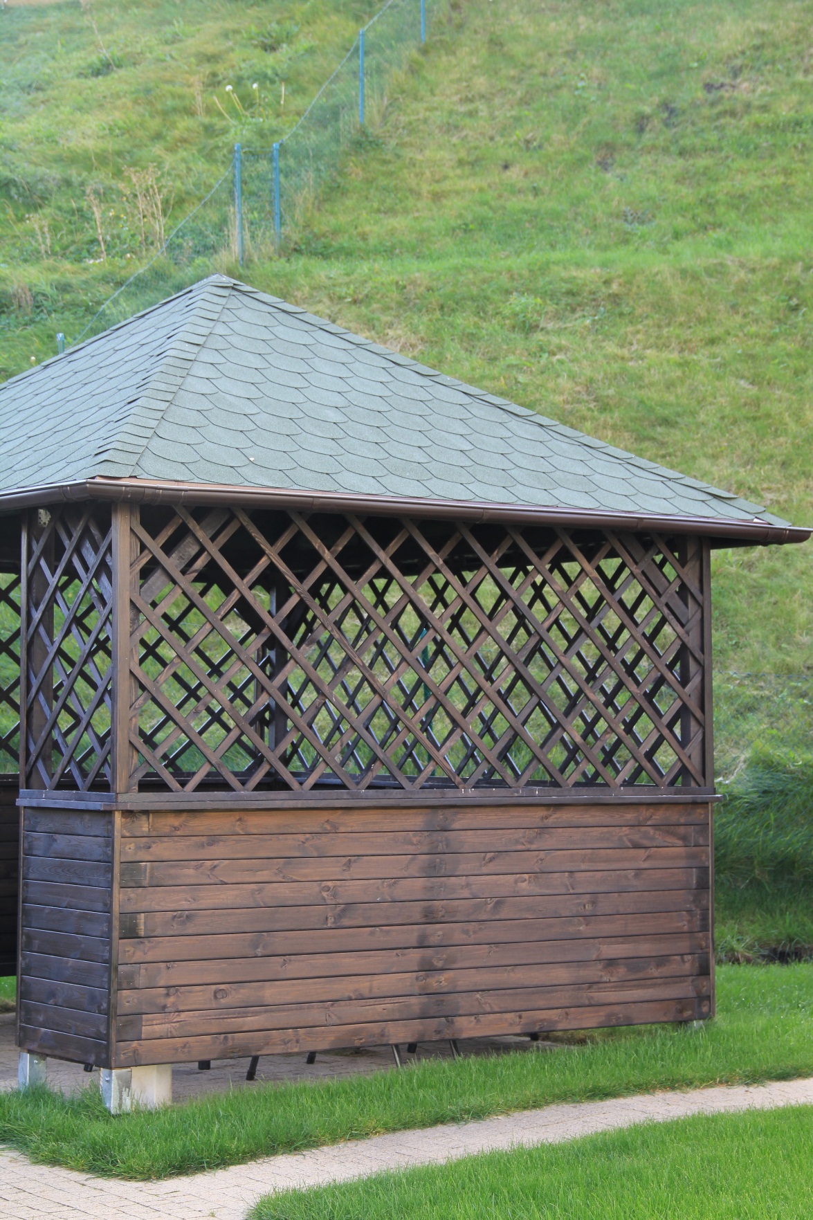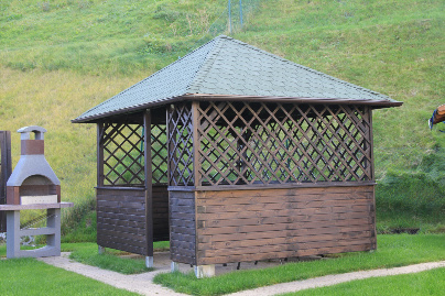 Altanka wykonana wg własnego projektu. Konstrukcja wykonana z drewna sosnowego heblowanego zabezpieczonego drewnochronem o kolorze palisander. Dach wykonany z płyt OSB gr.12 mm i pokryty gontem bitumicznym „ogon bobra” firmy IcoPal.