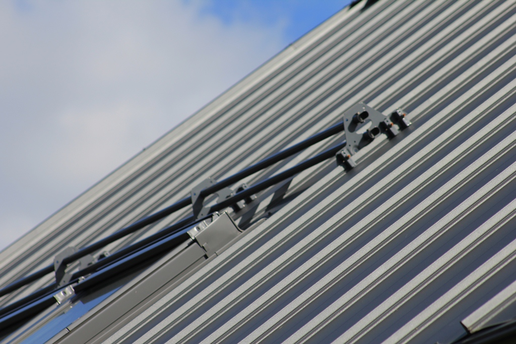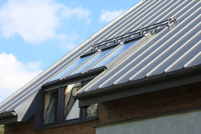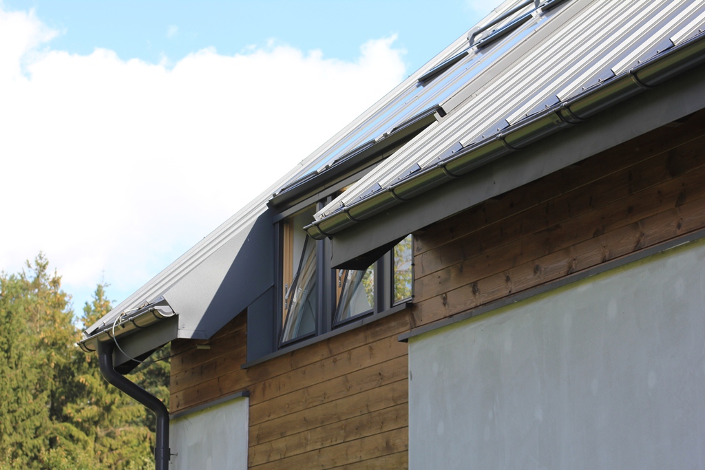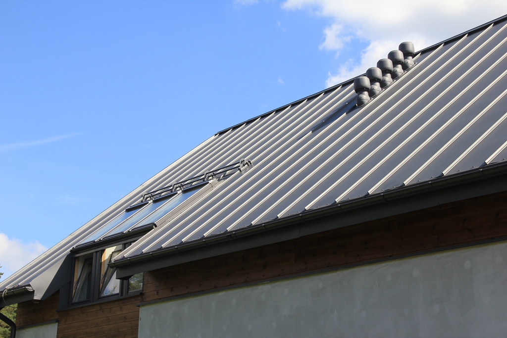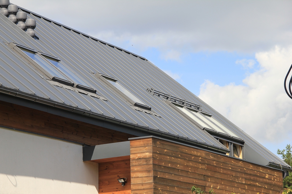 Dach wykonany z blachy płaskiej Ruukki Maxi Classic w systemie Click. System rynnowy Ruukki. Okna dachowe i kolankowe firmy Velux. Powierzchnia 200 m2.