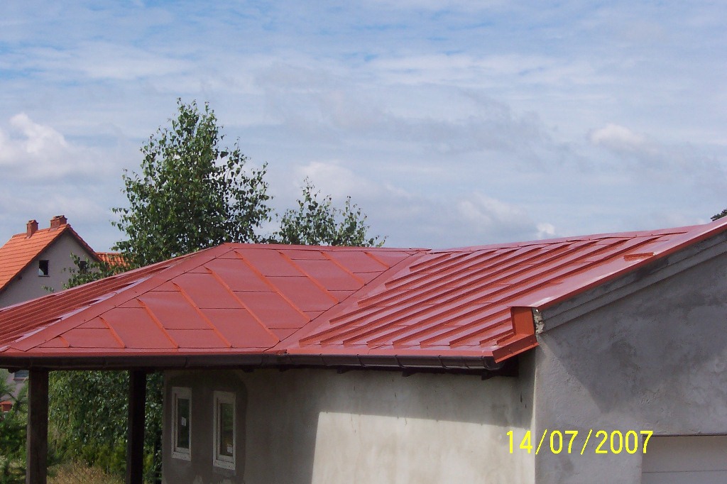 Dach odeskowany pokryty papą asfaltową na tekturze budowlanej W /400/1200 wierzchniego krycia a następnie blachą aluminiową na rąbek stojący. Wszystkie elementy połaci dachowej wykonane we własnym zakresie. System rynnowy Marley. Powierzchnia 100 m2.