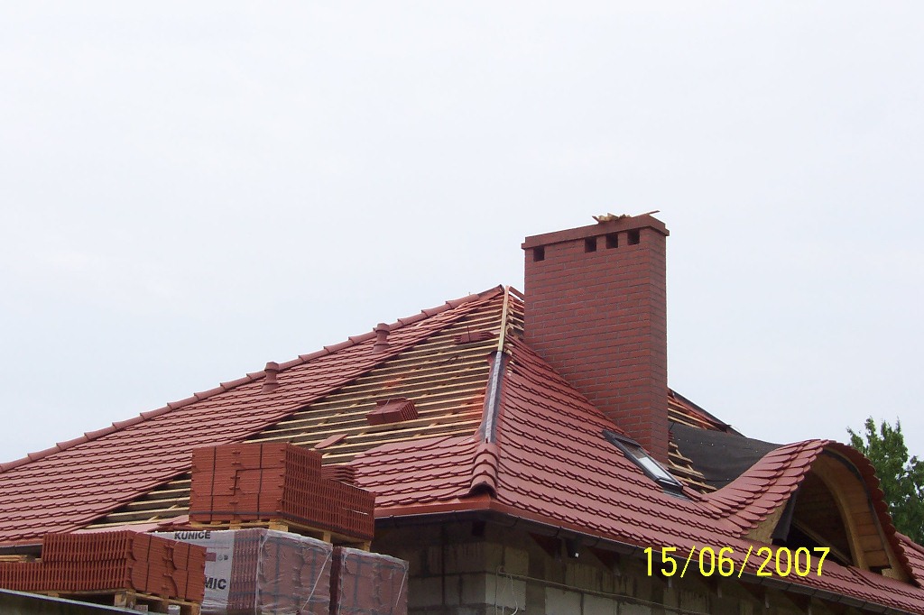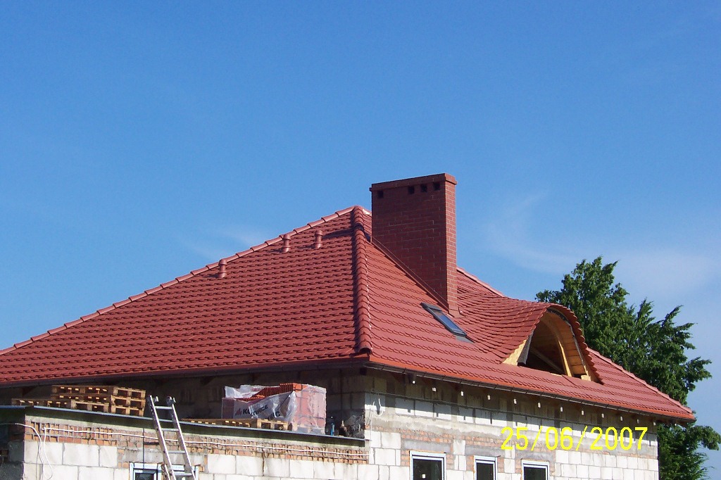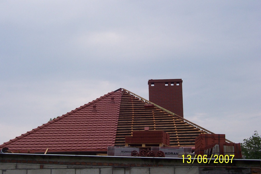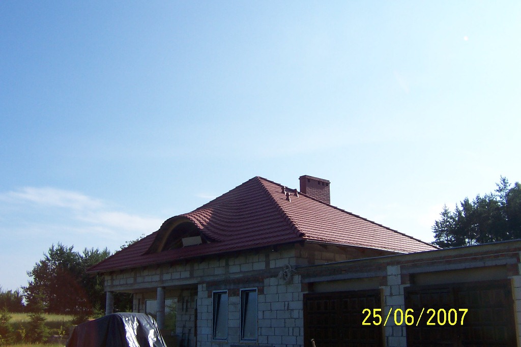 Materiał użyty do krycia dachu to dachówka ceramiczna karpiówka natura firmy Koramic. System rynnowy Galeco metal. Okno dachowe firmy Velux Powierzchnia dachu 180 m2. Powierzchnia garażu (dach płaski) 100 m2 hydroizolacja wykonana przy użyciu papy termozgrzewalnej Izolmat Plan PYE PV 250 S5 SS.
