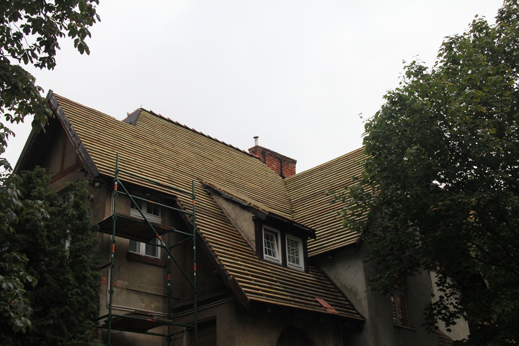 Demontaż jednej z trzech połaci dachu. Po zdemontowaniu starej dachówki karpiówki łączonej na zaprawę cementowo-wapienną, wzmocnieniu zgniłek krokwi koszowej i wymianie zgniłych desek gr. 25 mm, jako zabezpieczenie desek ułożona została membrana dachowa a pokrycie główne ułożono z dachówki ceramicznej firmy Koramic Wiekor karpiówka naturalna czerwień żłobkowana długa. Orynnowanie metalowe z blachy powlekanej firmy BudMat. Obróbki blacharskie z blachy powlekanej firmy BudMat. Powierzchnia dachu to ok.70 m2.