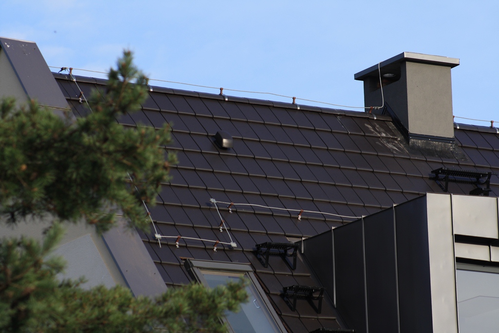 Dach przykryty dachówka ceramiczną RuppCermanika Turmalin szara. Okna dachowe firmy Velux. Obróbki blacharskie jak i części elewacji wykonane z blachy odwęglonej firmy Lindab. System rynnowy metalowy firmy Lindab. Powierzchnia dachu to 140 m2. Wykonano 4 takie dachy.
