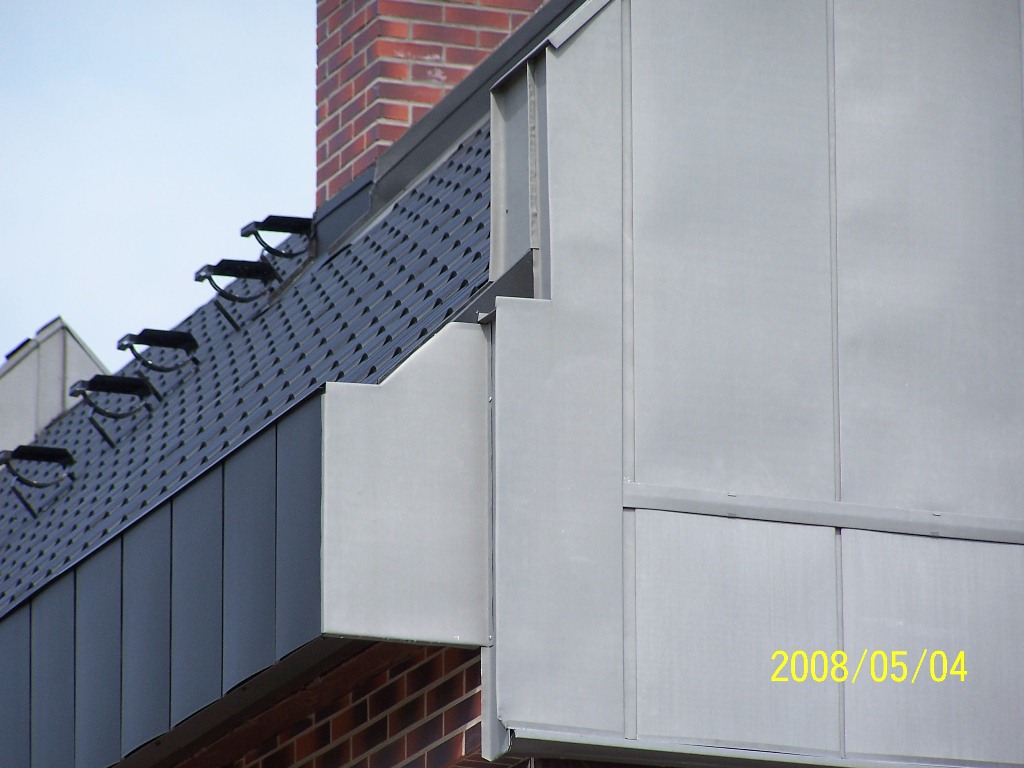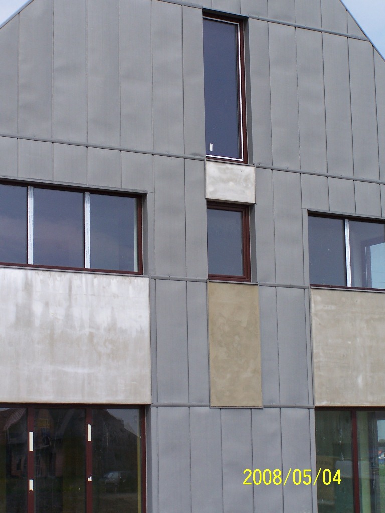 Blacha czołowa (elewacyjna) na budynku wykonana wg własnego pomysłu gięć i mocowań. Blacha elewacyjna :tytanowo- cynkowa patynowana gr. 0,7 mm firmy VN Zinc. Powierzchnia blachy elewacyjnej to 100 m2.