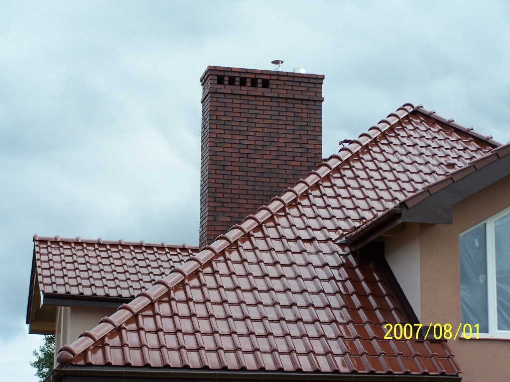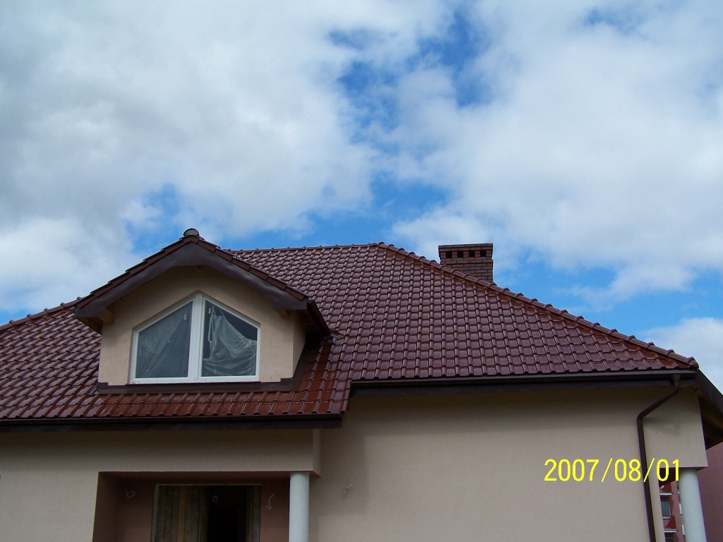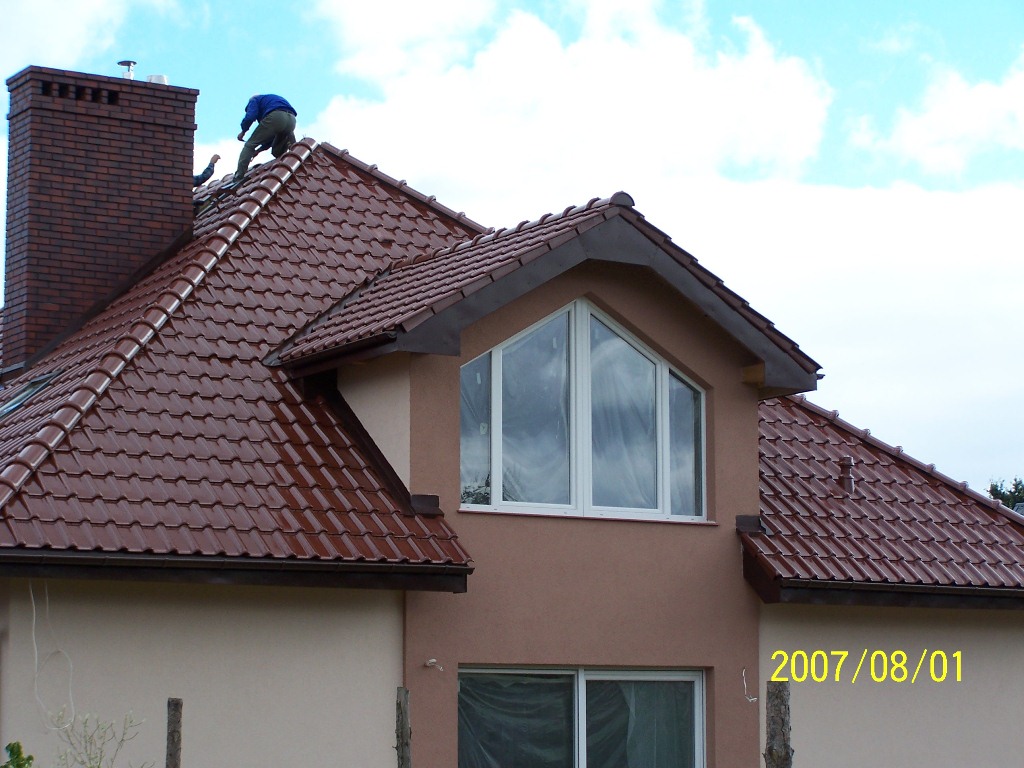 Dachówka ceramiczna Koramic L 15 czerwona angoba. System rynnowy Galeco metal. Okna dachowe firmy Okpol Powierzchnia dachu - 250m2.
