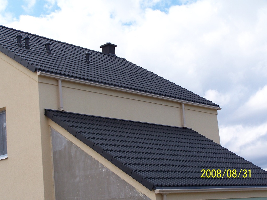 Dach powierzchnia: 140 m2. Pokryty dachówką betonową Euronit. System rynnowy : Nicolle Obróbki blacharskie z blachy powlekanej BudMat. Prace wykonywane dla dewelopera Ekolan S.A.