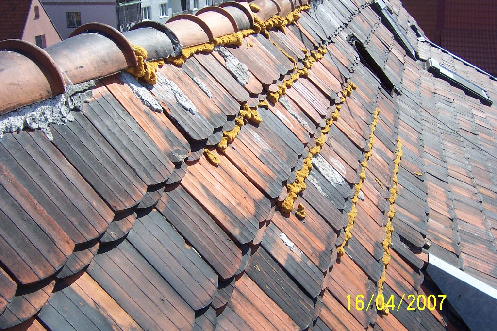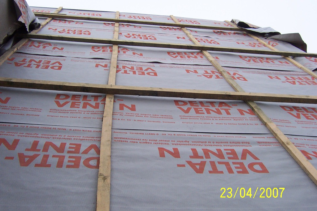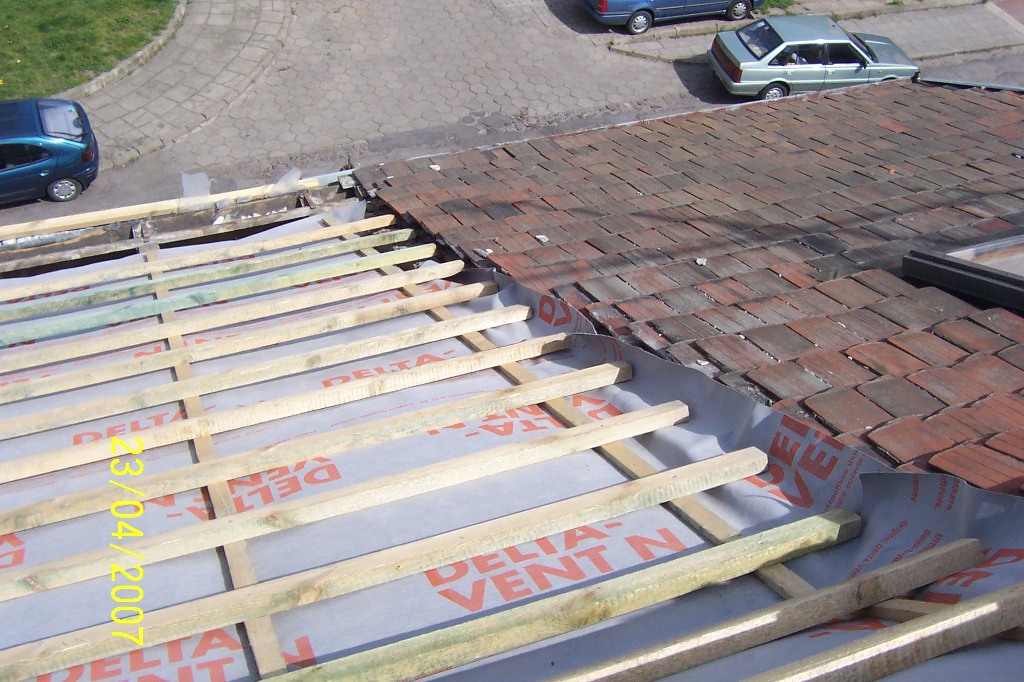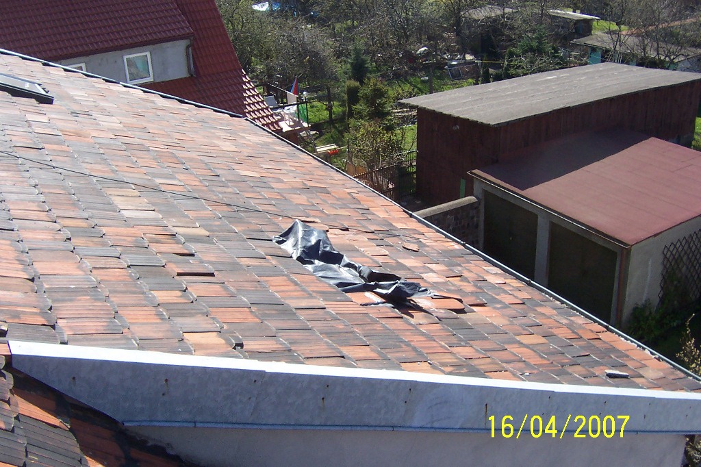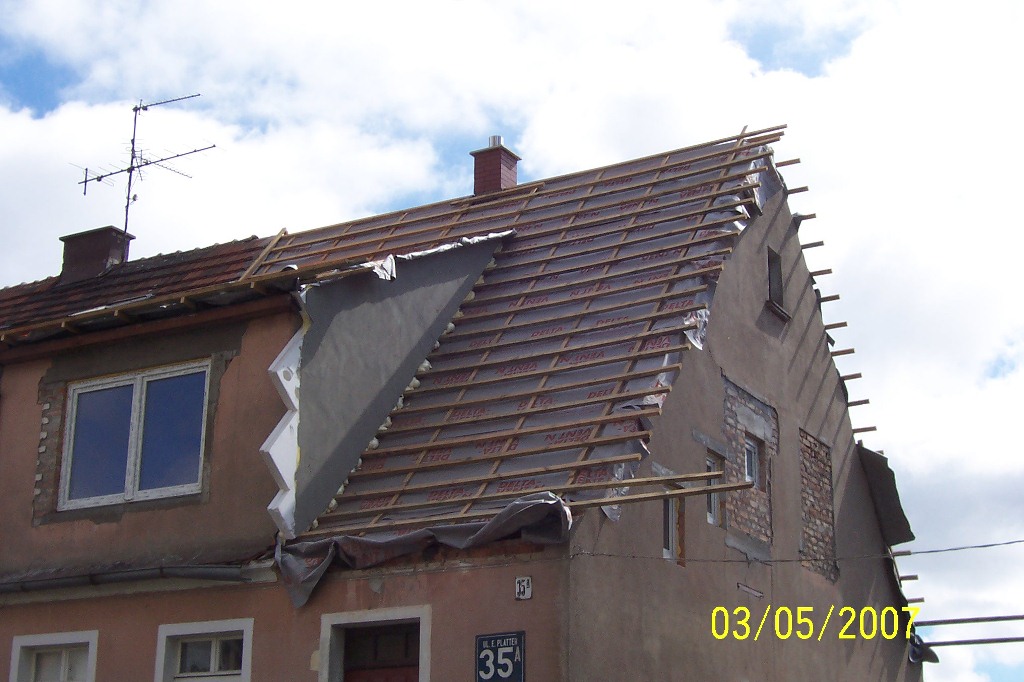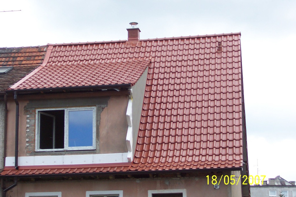 Rozbiórka starej połaci dachowej wykonanej z dachówki karpiówki łączonej na zaprawę wapienno-cementową. Dach zabezpieczony folią paroprzepuszczalną Delta Vent, dachówka ceramiczna Roben Fleming, system rynnowy Marley, okna dachowe Fakro. Powierzchnia 140 m2.