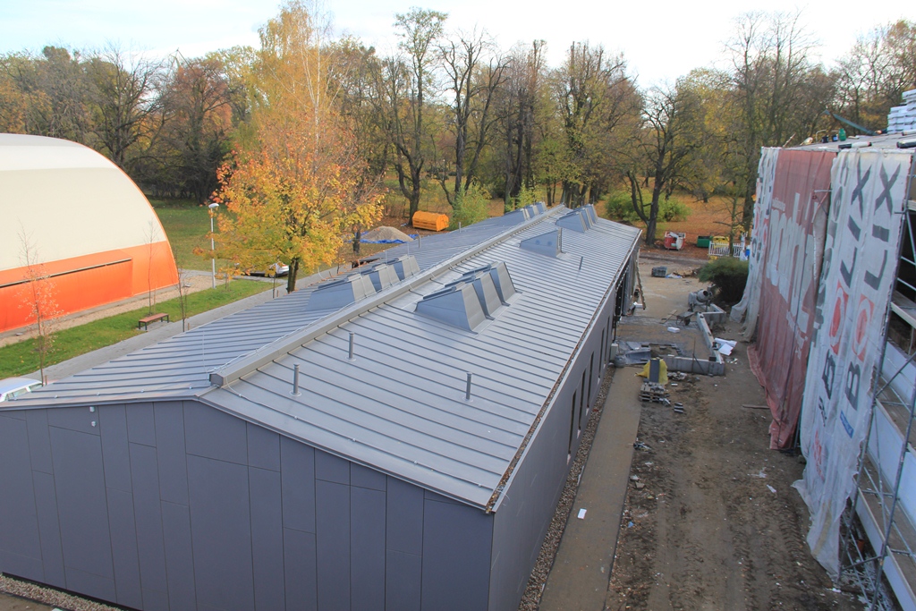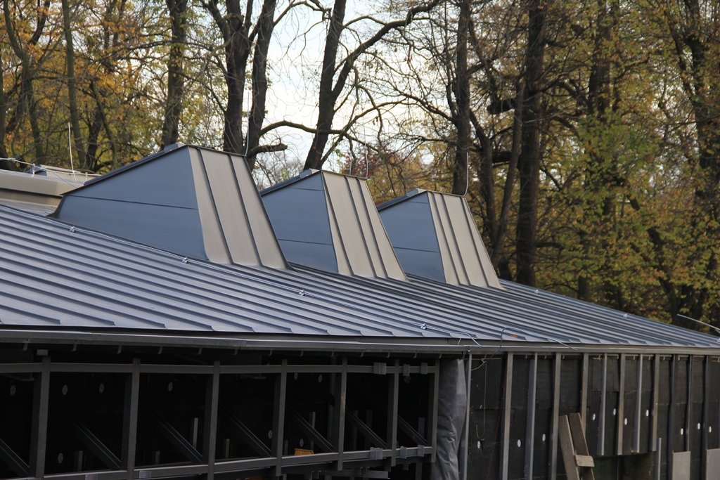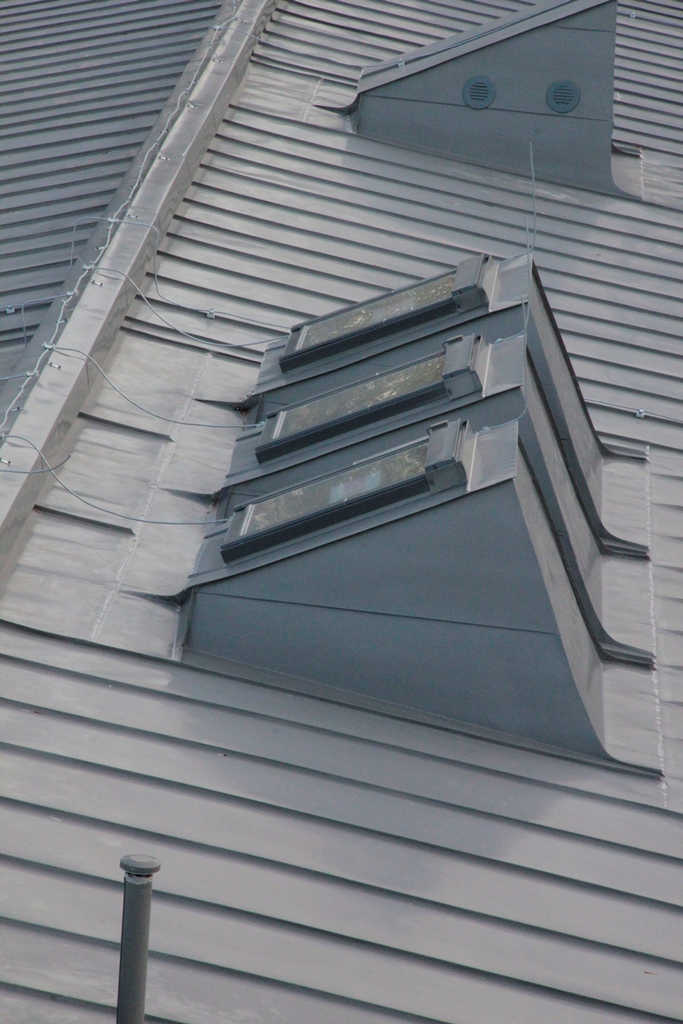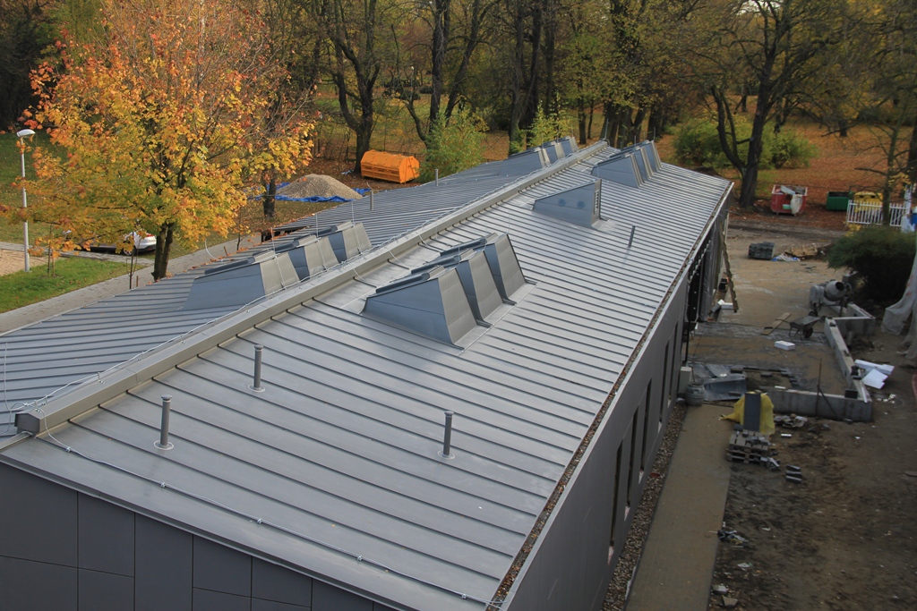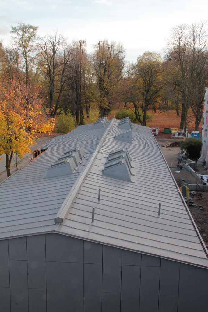 Powierzchnia dachu 420 m2. Pokrycie dachu wykonane zgodnie z technologią blachy tytanowo-cynkowej. Na konstrukcję stalową i drewniana ułożona membrana paroprzepuszczalna, kontrłaty , płyta OSB gr.18 mm, membrana paroprzepuszcalna, warstwa separacyjna z „makaronu” i do tego mocowana blacha tytanowo-cynkowa wyprofilowana na maszynie za pomocą haftrów ruchomych i stałych do płyty OSB. Konstrukcja okien dachowych wykonana zgodnie z projektem a w nich osadzone okna firmy Velux Integra sterowane elektrycznie. Do odprowadzenia wód opadowych skonstruowano koryta odpływowe z płyt OSB zabezpieczone papą termozgrzewalną a na wierzch blacha tytanowo-cynkowa. Wszelkie łączenia blach wykonano przy użyciu uszczelniacza elastycznego SikaFlex -11FC.