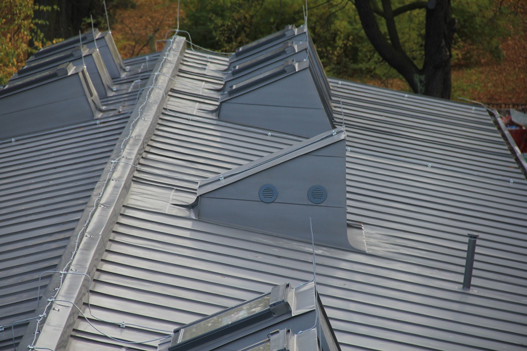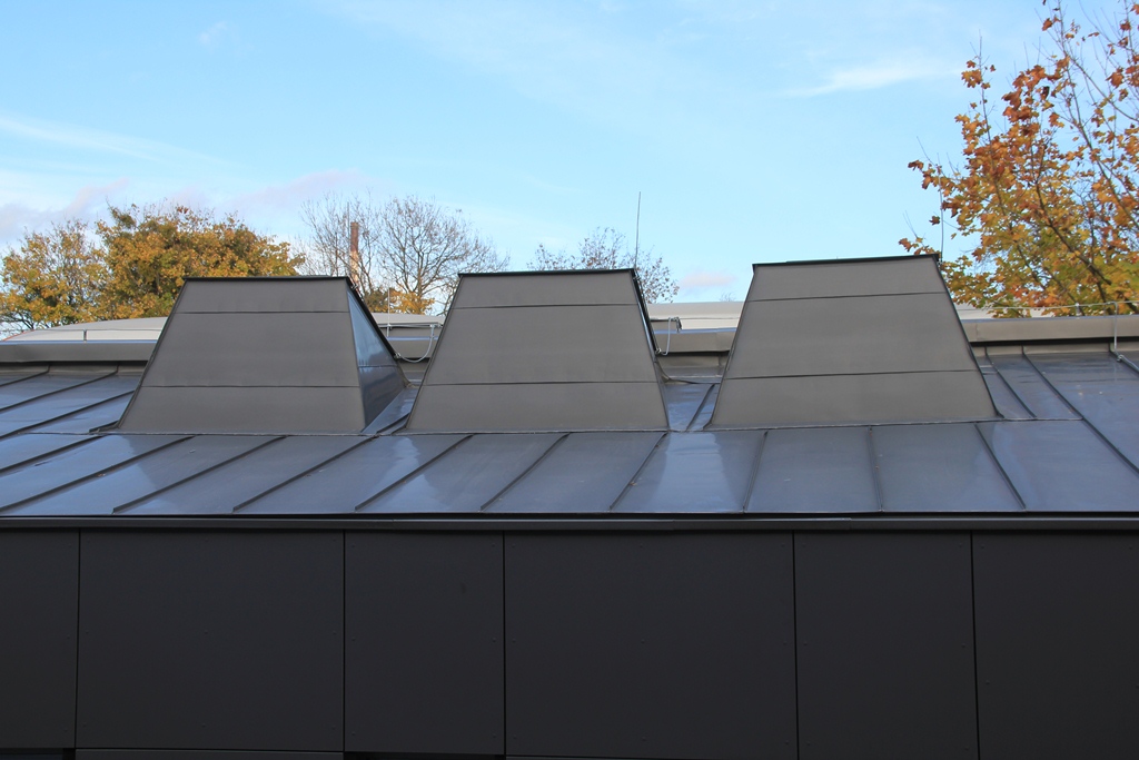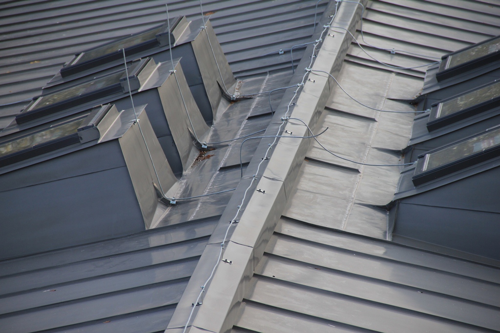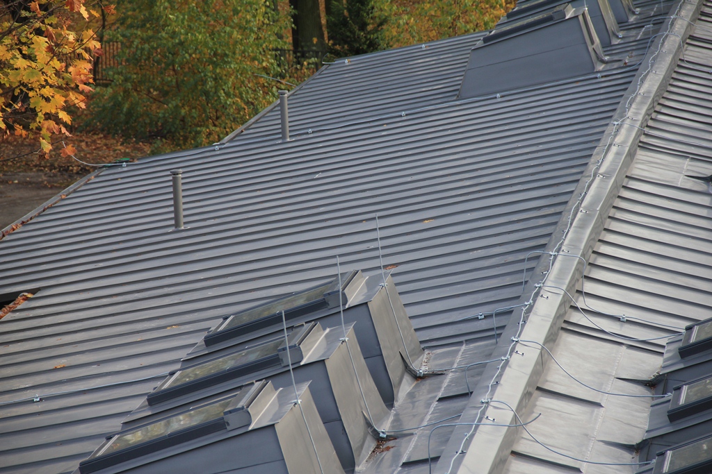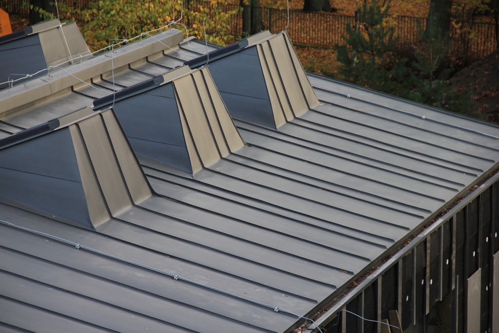 Powierzchnia dachu 420 m2. Pokrycie dachu wykonane zgodnie z technologią blachy tytanowo-cynkowej. Na konstrukcję stalową i drewniana ułożona membrana paroprzepuszczalna, kontrłaty , płyta OSB gr.18 mm, membrana paroprzepuszcalna, warstwa separacyjna z „makaronu” i do tego mocowana blacha tytanowo-cynkowa wyprofilowana na maszynie za pomocą haftrów ruchomych i stałych do płyty OSB. Konstrukcja okien dachowych wykonana zgodnie z projektem a w nich osadzone okna firmy Velux Integra sterowane elektrycznie. Do odprowadzenia wód opadowych skonstruowano koryta odpływowe z płyt OSB zabezpieczone papą termozgrzewalną a na wierzch blacha tytanowo-cynkowa. Wszelkie łączenia blach wykonano przy użyciu uszczelniacza elastycznego SikaFlex -11FC.