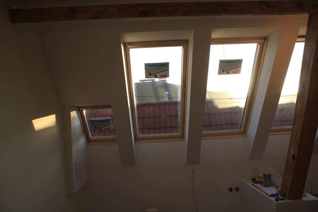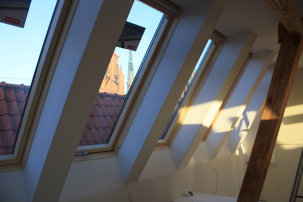 Dla Instytutu Morskiego w Gdańsku wymieniana była stara konstrukcja świetlików dachowych na okna połaciowe firmy Velux. Okna wymieniane są rozmiarów 78x160 cm i jest ich 10 szt. Zaprzyjaźniona firma budowlana wykonała prace wykończeniowo-remontowe wnętrza co ukazane jest na zdjęciach.